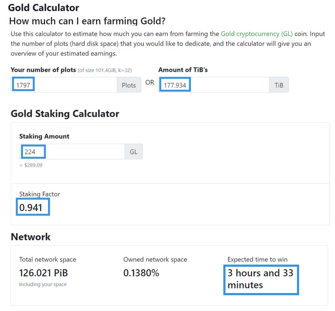 Staking the default is 20.05 ,For example, you have 100T, if you do not staking, it is approximately equal to 4.9875T; if you staking 100GL, it is equal to 100T,if miner stake 1000GL,approximately equal to 169T, this is your personal difficulty. the simplified formula will look like this your personal difficulty x estimated time to win: https://chiaforkscalculator.com/gold