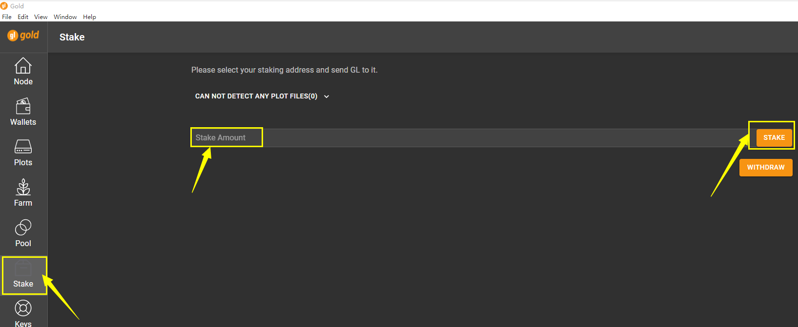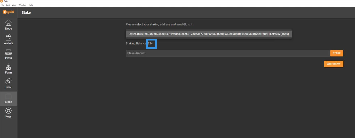 Enter the amount that you want to stake in the tab of Stake then click STAKE to confirm. If you need to withdraw your gl, just click WITHDRAW. That is it.